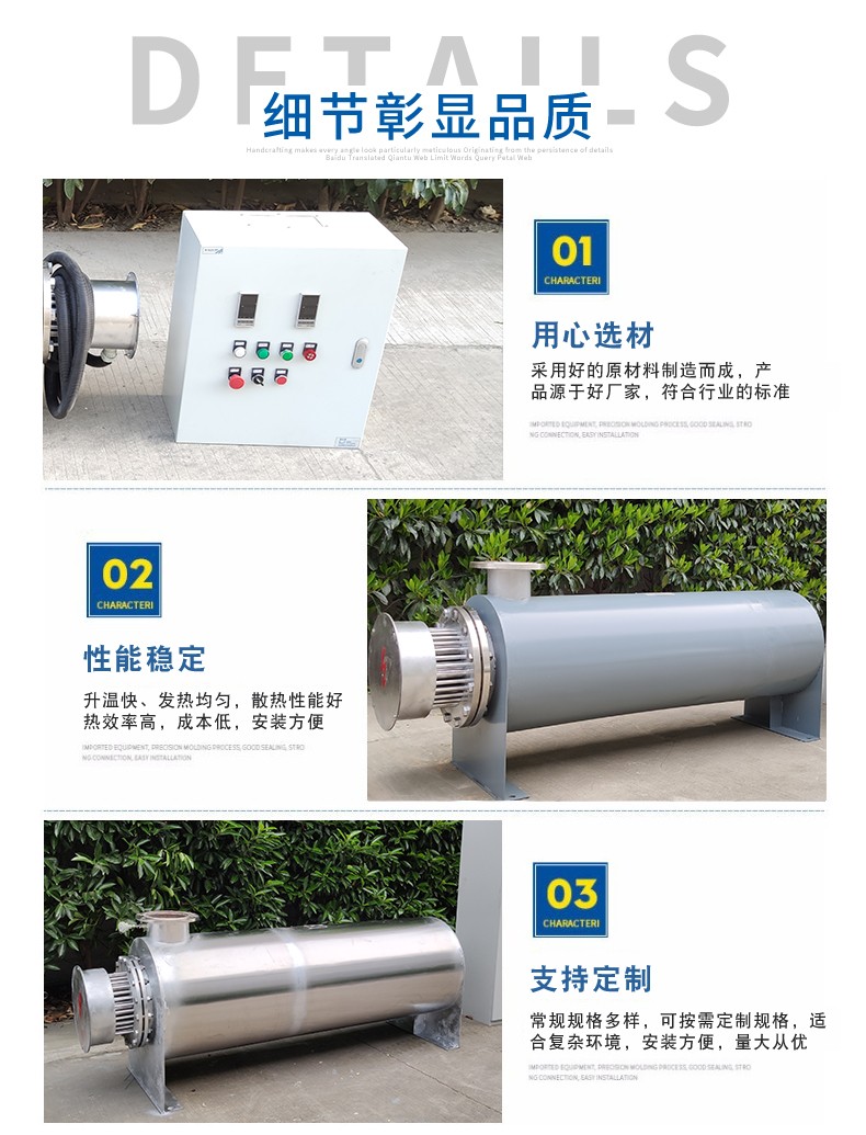 管道電加熱器主要是對(duì)介質(zhì)進(jìn)行加熱的電加熱設(shè)備,以電轉(zhuǎn)換成熱能。采用不銹鋼電加熱管為發(fā)熱元件,產(chǎn)品內(nèi)部設(shè)有多個(gè)導(dǎo)流板,引導(dǎo)著介質(zhì)在內(nèi)腔的滯留時(shí)間,從而使介質(zhì)充分受熱均勻,提高熱交換率。管道電加熱器的內(nèi)部高溫電壓系統(tǒng)由金屬管構(gòu)成,在工作時(shí),高溫循環(huán)系統(tǒng)內(nèi)部具有絕緣導(dǎo)熱性能良好的氧化鎂鋁,管口兩端由硅膠陶瓷密封,結(jié)構(gòu)不但先進(jìn),加熱效果極佳,是節(jié)能環(huán)保型管道電加熱器。